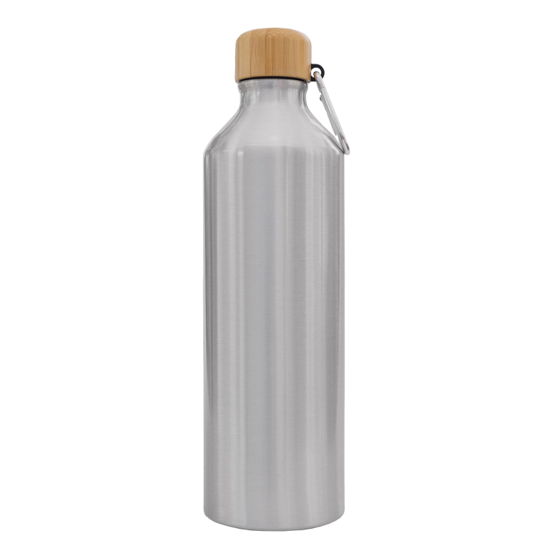 алюминиевая бутылка для воды объемом 800 мл с карабином. Он имеет герметичную крышку, которая предотвращает утечку жидкостей. Шапочка из бамбука.