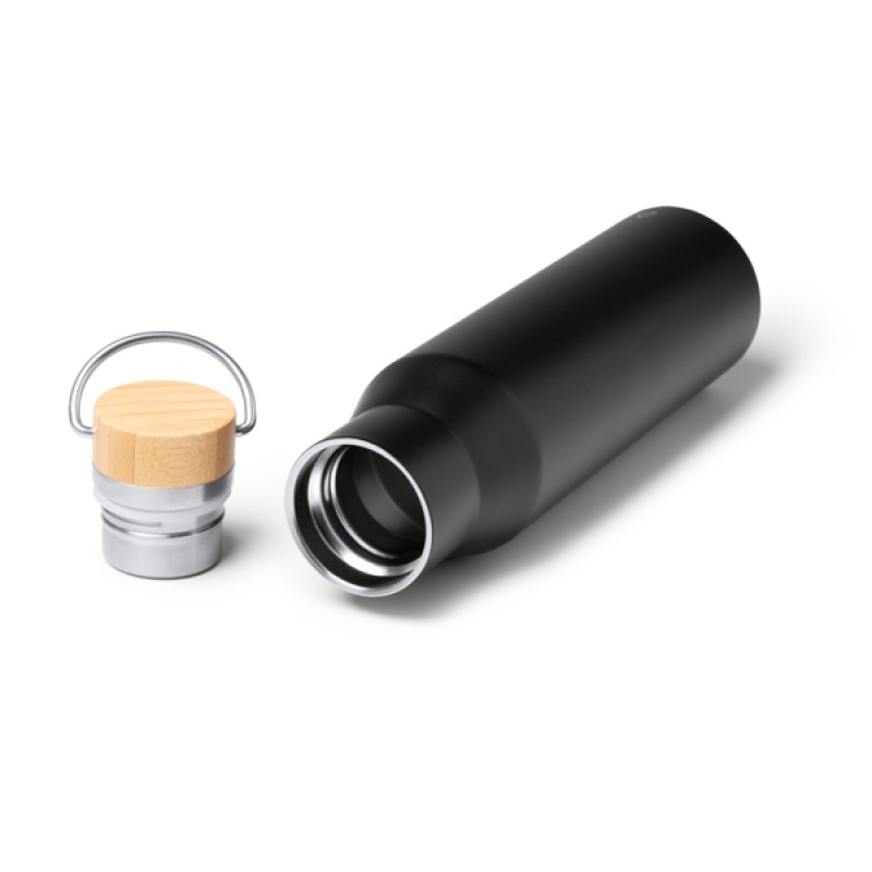 Двухслойная термос-бутылка из нержавеющей стали 304 с бамбуковой крышкой. Вместимость 550 мл. Поставляется в экологической упаковке в стиле эко.