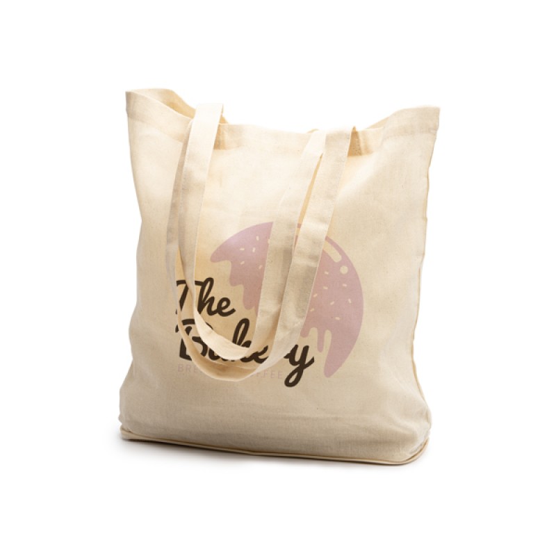 Складная сумка из 100% хлопка (110 г/м²) с дном из джута. В комплекте наружный карман. Усиленные ручки длиной 60 см. Легкое складывание и молния.