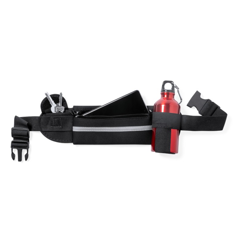 Поясная сумка из мягкого материала с одним карманом на молнии, одним небольшим карманом и эластичным держателем для бутылки, светоотражающей полосой и регулируемым ремешком.