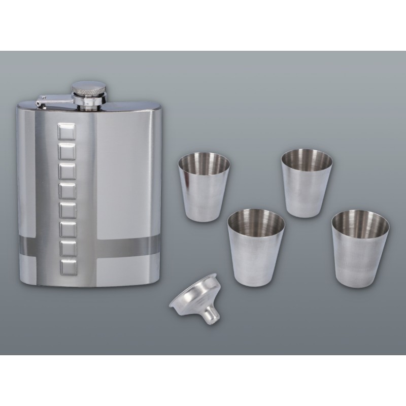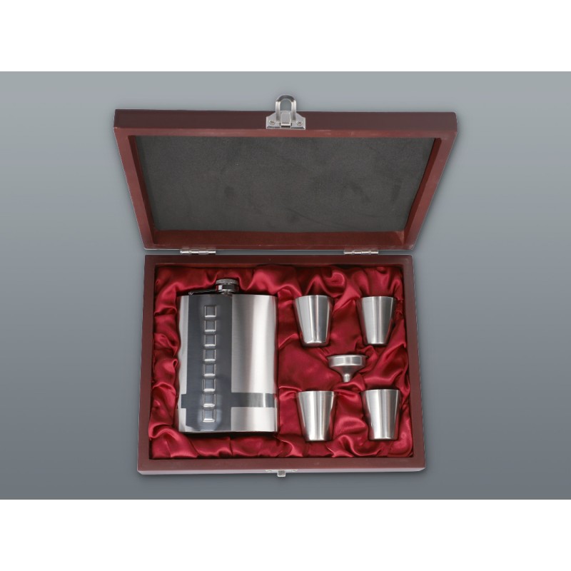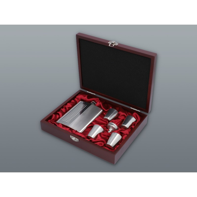 Подарочный набор, состоящий из фляги емкостью 235 мл, 4 рюмок (4 х 35 мл) и воронки. Все упаковано в элегантную коробку.