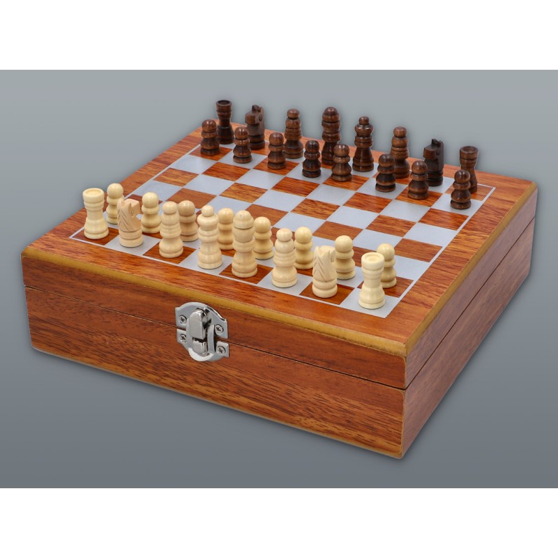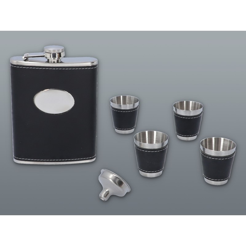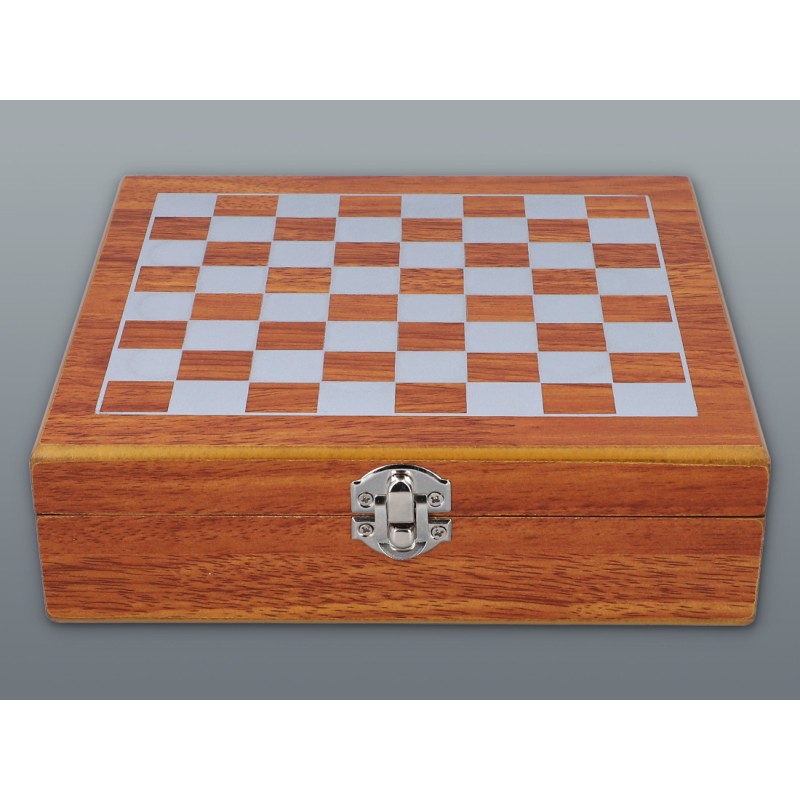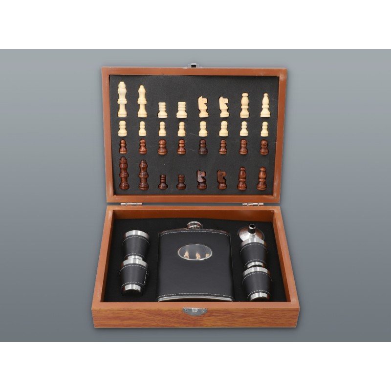 Элегантный подарочный набор, состоящий из: фляги объемом 240 мл, 4 рюмок (4 х 35 мл), воронки и шахмат. Все упаковано в деревянную коробку.