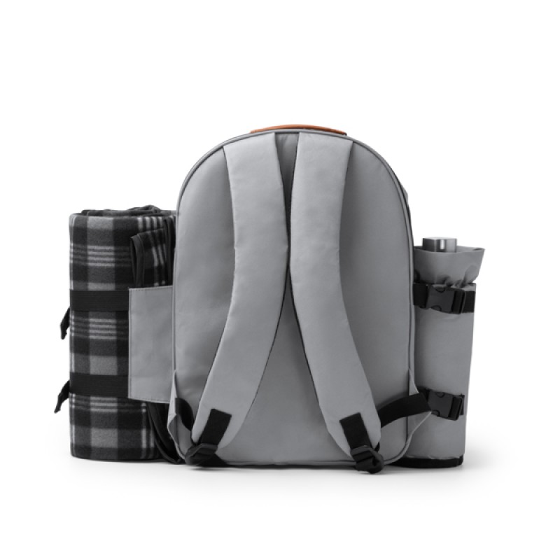 Пикник-рюкзак из RPET полиэстера. Основное отделение включает: 4 кружки, 4 тарелки, 4 набора столовых приборов, 2 тканевые салфетки. Односторонний отсек для пикник-одеяла (включено) и односторонний отсек для бутылок.