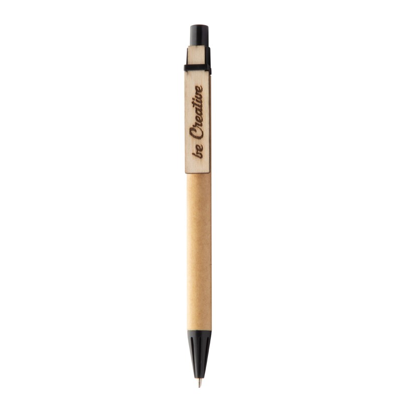Шариковая ручка из переработанной бумаги с деревянным зажимом на заказ и синим стержнем. Клипса изготавливается нестандартной формы - максимальный размер: 25 × 35 мм. Цена включает гравировку логотипа на клипсе. Минимальный заказ: 100 шт.