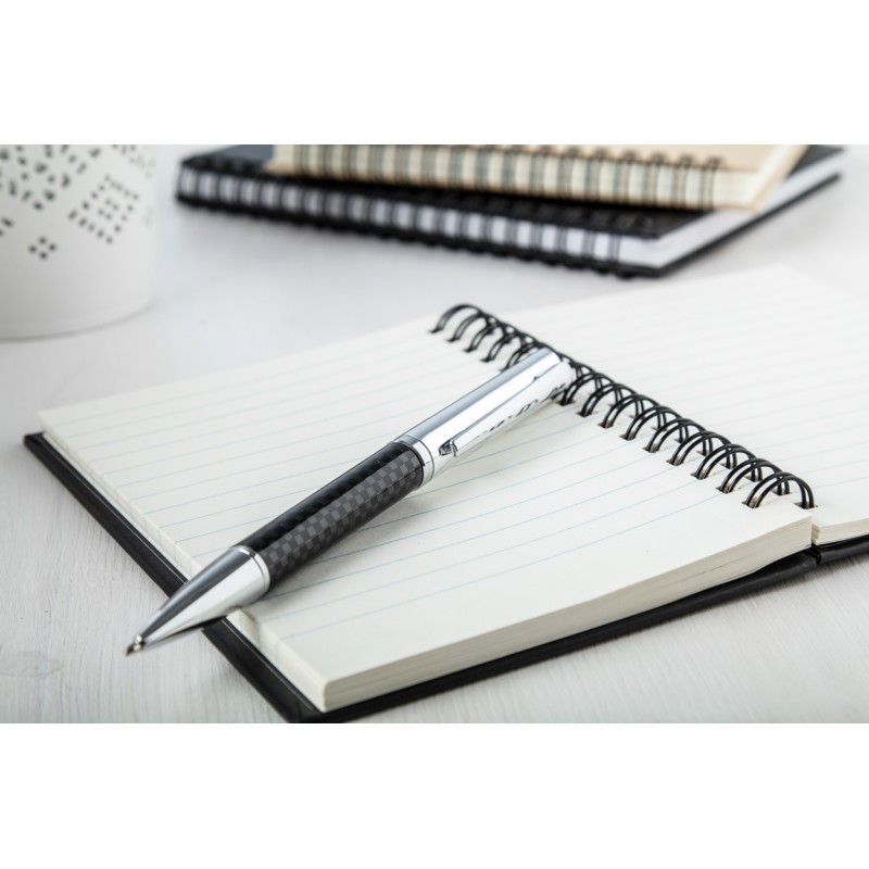 Металлическая шариковая ручка с корпусом из карбона и синим стержнем.