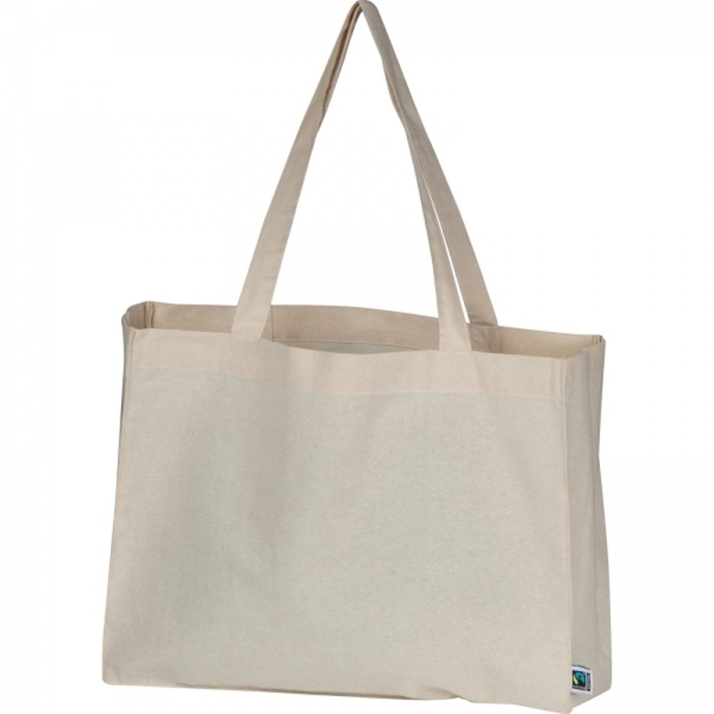 Большая сумка из хлопка Fairtrade (плотность 180 г/м²) с широким дном и этикеткой Fairtrade.